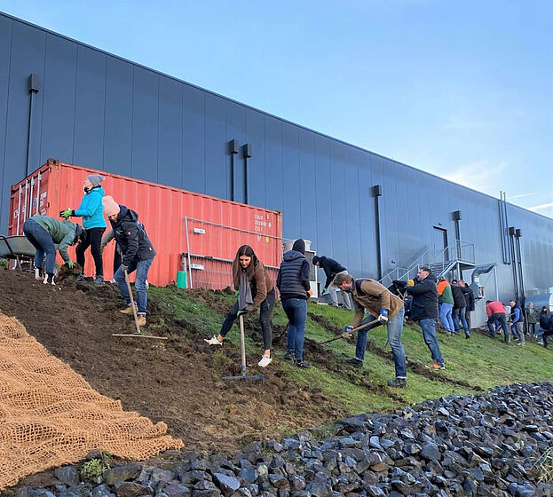 Under the guidance of the gardening and landscaping company Windt & Schröder, Team Garbe took on a 400 m² lawn leased by HafenCity at Baakenhöft Park. After jointly digging up and removing the partly very steep areas, it was the task of the employees to carefully embed a whole 1,500 native wild shrubs in 200 m² of coconut netting. Besides lavender, oregano and yarrow, wild strawberries were also carefully transplanted on this day. In order to make the best possible use of the entire area, butterfly and wild bee hem was subsequently sown on unplanted areas. In spring 2022, a colourful flowering meadow is to be created on site, which will then be complemented by two high-quality wild bee hotels, which are currently still being produced.