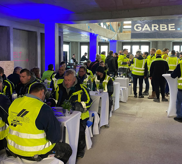 Together with 250 guests, Tobias Hertwig, Fabian von Köppen and Dirk Heidkämper, Managing Director of Garbe Immobilien-Projekte, celebrated the topping-out ceremony with the more than 100 construction workers involved. Guests included Dr. Andreas Kleinau, CEO of HafenCity Hamburg GmbH, Bruno Escur, Director of Development for Unibail-Rodamco-Westfield’s Westfield Hamburg-Überseequartier, Olaf Goebel, Managing Director of SWS, and Peter Czekay, Associate Project Manager at léonwohlhage Architekten.