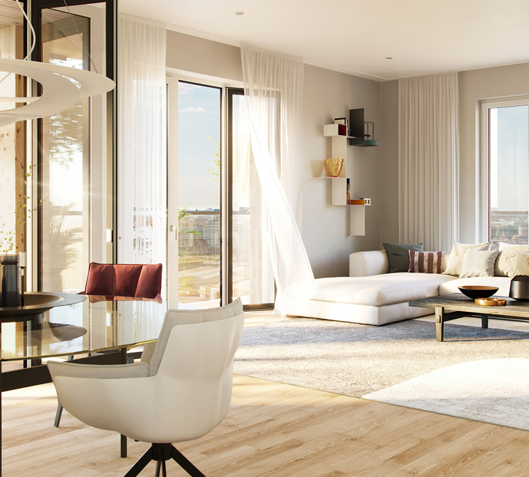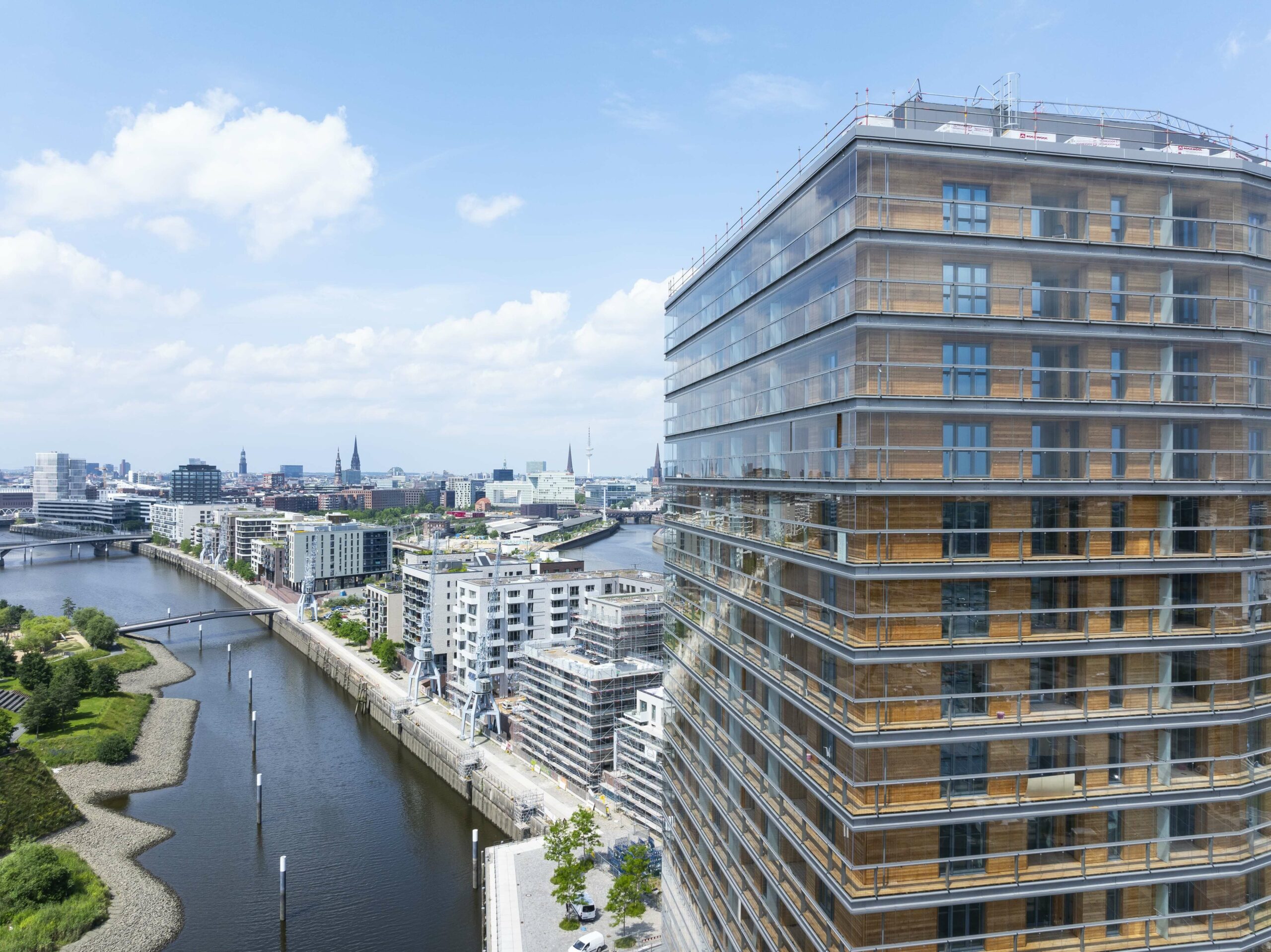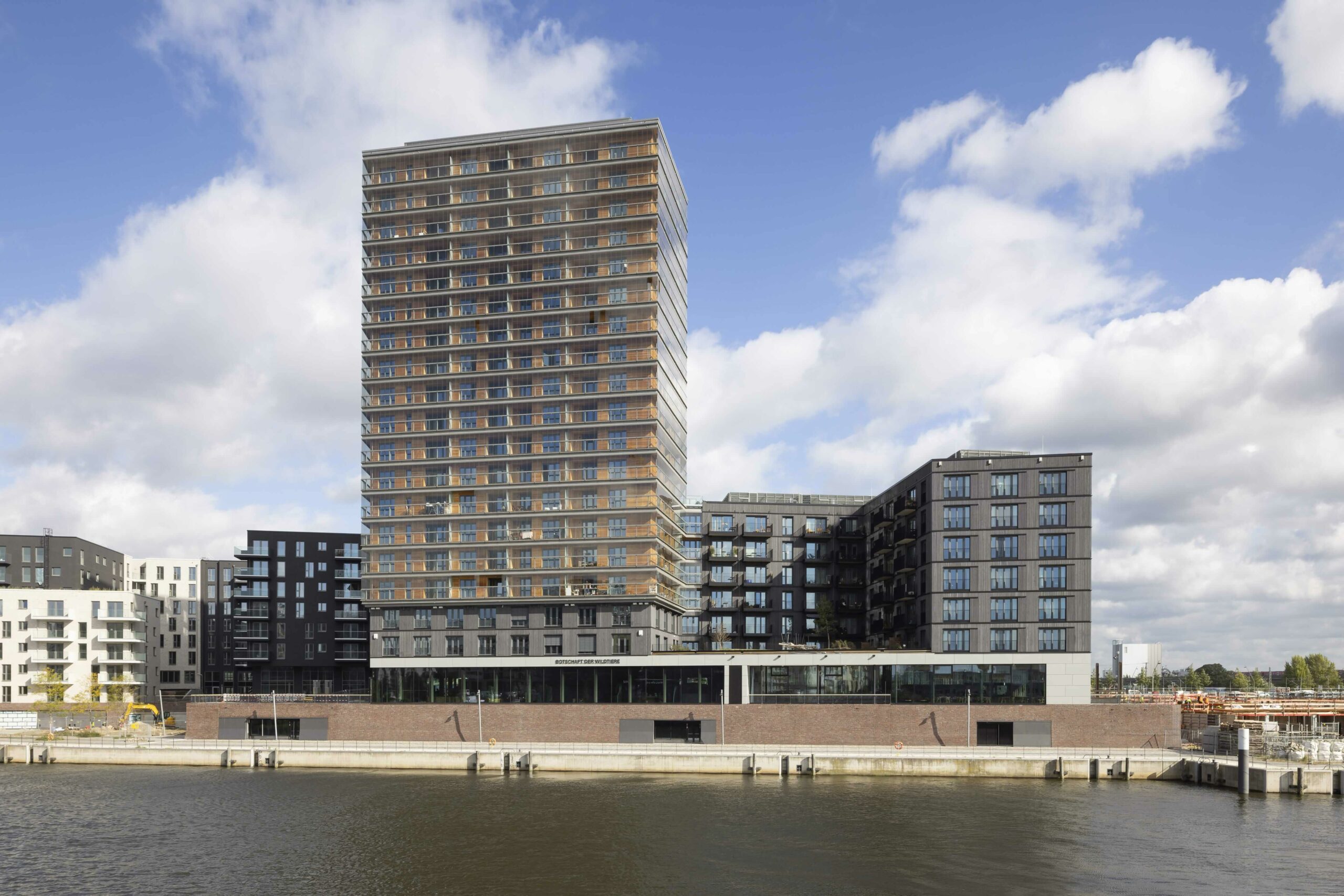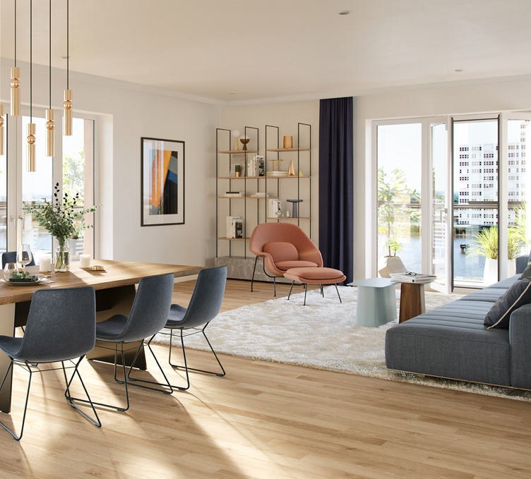 A symbiosis of urbanity and the environment: we are developing 181 residential units – 128 owner-occupied flats and 53 publicly subsidised flats – on a gross floor area of some 20,600 square metres. The design by Hamburg-based architectural firm Störmer Murphy and Partners combines high-end architecture with an increasing desire for affinity with the natural world. Views of the port, the HafenCity district and the city centre are rounded off by the natural properties of wood and light, a 600-square meter communal inner courtyard and the inclusion of an interactive exhibition by Deutsche Wildtier Stiftung. Completion was in 2024, with an investment volume of approx. €140 million.